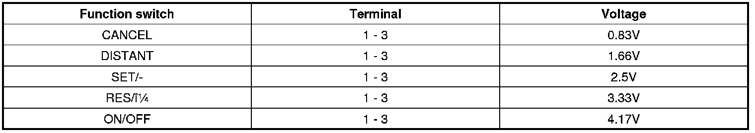 2. Measure voltage between terminals on the harness side connector when each function switch is ON (switch is depressed).