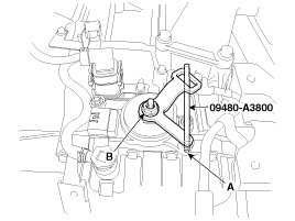 Use a SST (09480-A3800) or 0.1969in.( 5mm) bolt, fix the inhibitor manual control lever in the N jig hole (A) when you assemble the inhibitor (B).