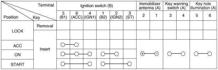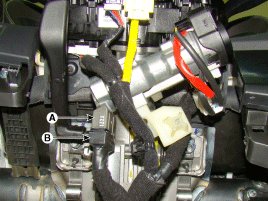 1. Disconnect the ignition switch connector (B) and key warning switch connector (A) from under the steering column.