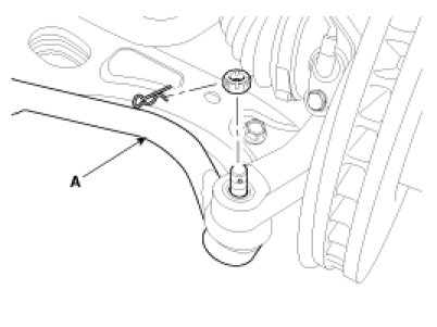 3. Remove the split pin and castle nut and then disconnect the tie-rod end (A) from the front knuckle.