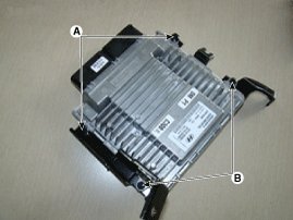 6. After removing the installation nuts (A) and screws (B), remove the ECM (C) from the bracket.