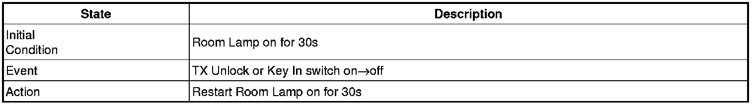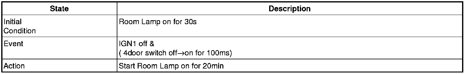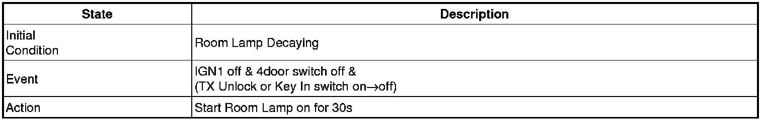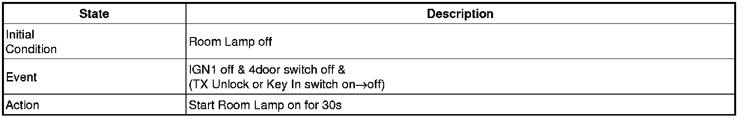 - 4 Door in closed IGN1 off & (Key in -> Key out): 30-second delay will be lights out.