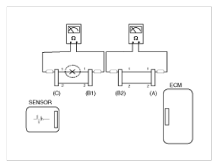 1. Disconnect connectors (A), (C) and measure resistance between connector (A) and (C) as shown in [Fig 2]. In [Fig 2.] the measured resistance of line 1 and 2 is higher than 1MΩ and below 1 Ω respectively. Specifically the open circuit is line 1 (Line 2 is normal). To find exact break point, check sub line of line 1 as described in next step.