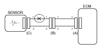 In this case the measured resistance between connector (C) and (B1) is higher than 1MΩ and the open circuit is between terminal 1 of connector (C) and terminal 1 of connector (B1).