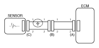 - With each connector still connected, measure the voltage between the chassis ground and terminal 1 of each connectors (A), (B) and (C) as shown in [Fig 4].