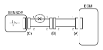 If the measured resistance between connector (C) and (B1) is 1M Ω or higher, and the resistance between (B2) and (A) is 1 Ω or lower, line 1 of connector (C) and line 1 of connector (B1) are open circuits.