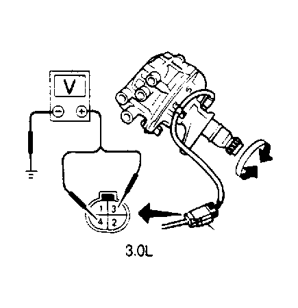 - To test crankshaft angle sensor, Remove crankshaft angle sensor (Q45) or distributor (M30). Leave sensor wiring connected. Using a logic probe or DVOM with an analog bar graph function, touch negative lead to ground and positive lead to one degree and 45/60 degree signal terminals of ECU. See CRANK ANGLE SENSOR SIGNAL HARNESS TERMINALS table. See Fig 1 or Fig 2 .
