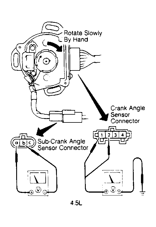 - Rotate sensor by hand. On a DVOM, one-degree signals should measure about 2.3-2.8 peak volts with sensor rotating. The 45/60-degree signal should measure about .1-.4 peak volt with sensor rotating. If either signal is not present, replace crank angle sensor. On Q45 models, also see SUB-CRANK ANGLE SENSOR (Q45) in this article.