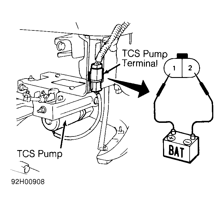TCS pump motor should operate when battery voltage is applied. Do not apply battery voltage for more than 5 seconds. See Fig 1 .