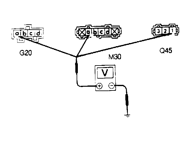 - Ensure no dust or foreign material exists in hot wire air passage. Fold back airflow meter harness connector boot. Turn ignition on. Connect negative lead of voltmeter to ground. Using positive lead, backprobe airflow meter terminal No. 1 on Q45 or terminal "a" on G20 and M30. See Fig 1 to 3. Voltmeter should read as specified. See AIRFLOW METER VOLTAGE SPECIFICATIONS table.