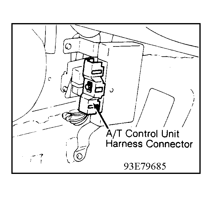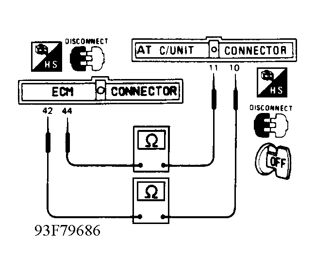 Turn ignition off. Disconnect ECM harness connector and A/T control unit harness connector. Verify harness continuity between ECM connector terminal No. 42 and A/T control unit connector terminal No. 10 (White/Red wire). Verify harness continuity between ECM connector terminal No. 44 and A/T control unit connector terminal No. 11 (White/Blue wire). See Fig 1 and Fig 2 . If continuity is present, perform FINAL CHECK . If continuity is not present, check harness and connectors between ECM and A/T control unit. Repair harness or connectors as necessary and perform FINAL CHECK .