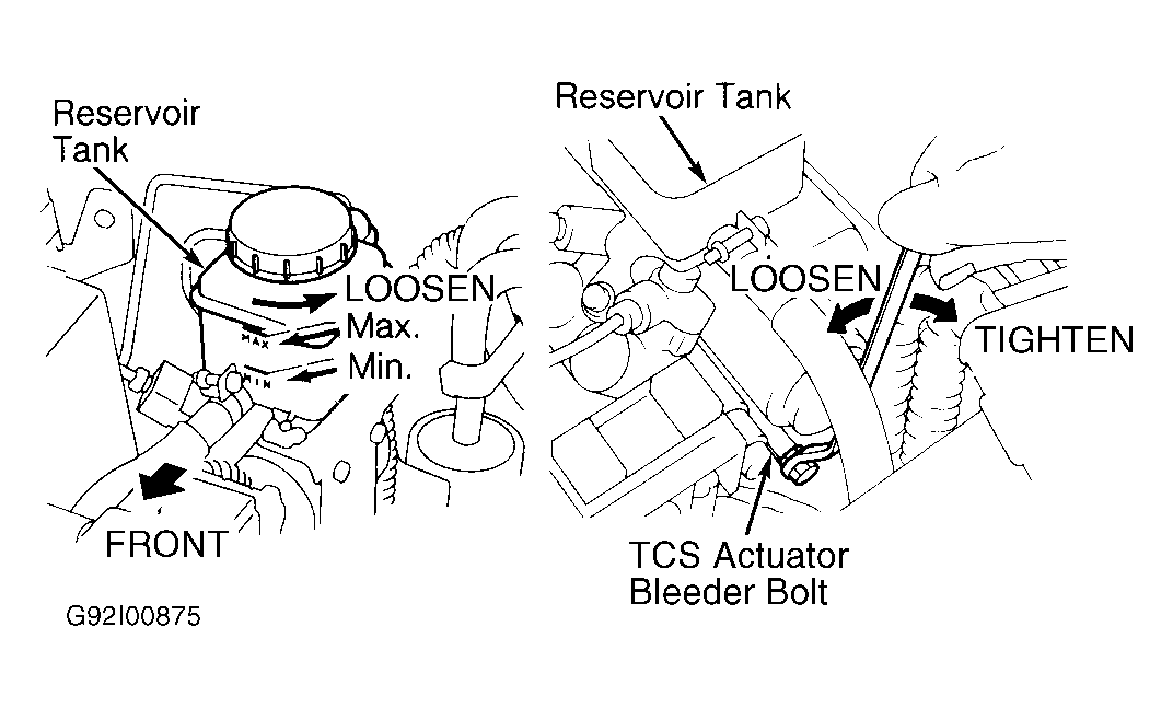 1. Loosen TCS actuator bleeder. Remove cap and fill reservoir tank to MAX with new DOT 3 brake fluid. Do not reinstall cap at this time.