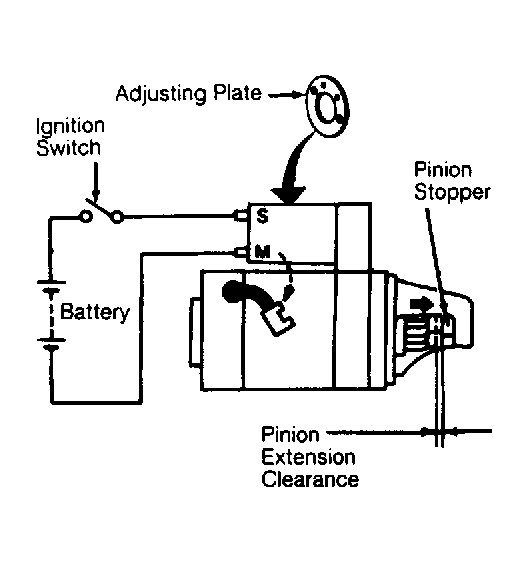 - Disconnect "M" terminal lead from solenoid. Energize solenoid. Push pinion back by hand to remove slack, and measure distance between pinion and pinion stopper. See Fig 1.