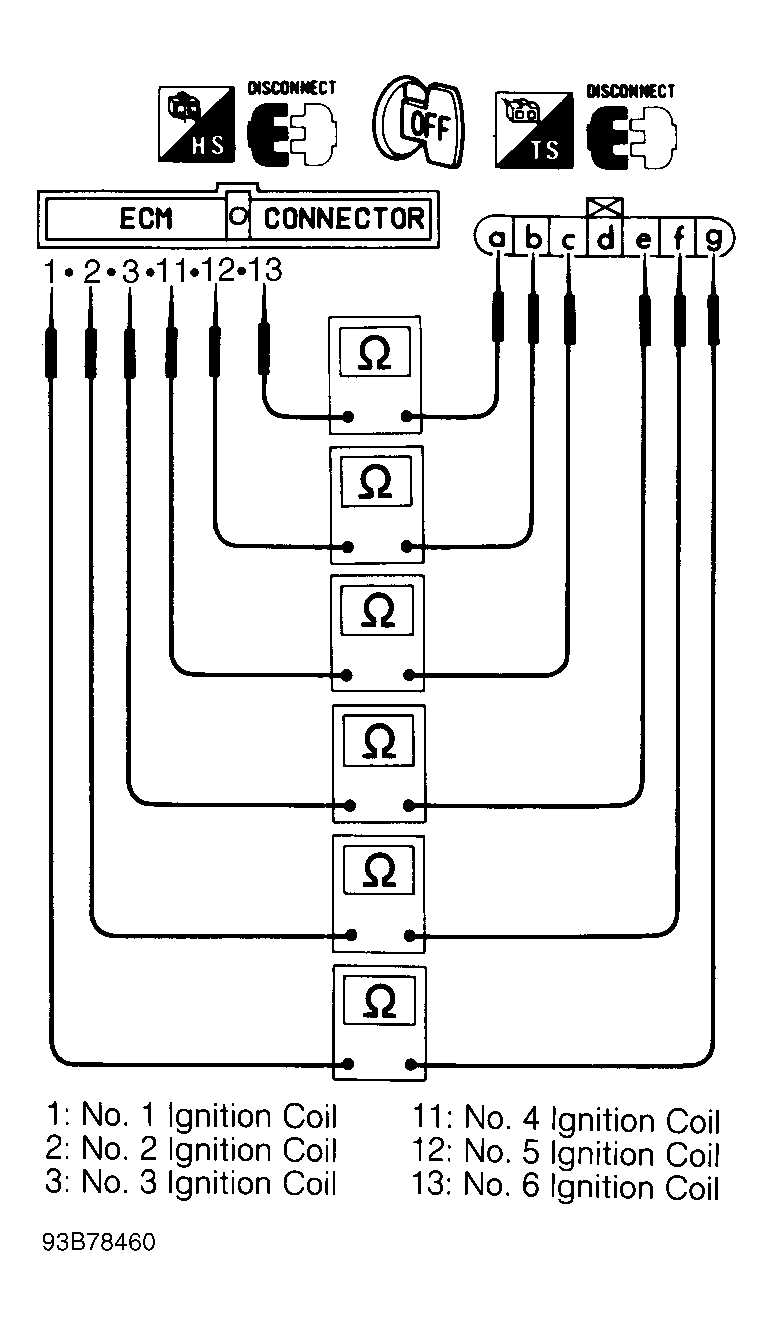 - Check harness continuity between ECM and ignition coil in each cylinder. See Fig 1