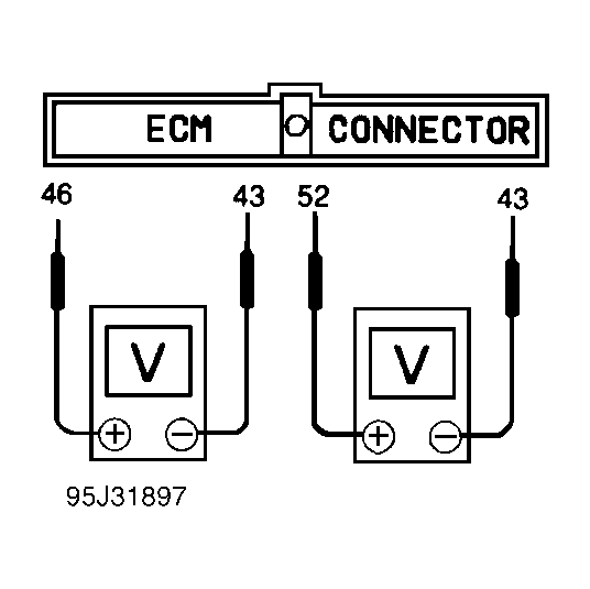 - Attach positive probe of voltmeter to ECM connector terminal No. 52 (rear H02S) and negative probe to terminal No. 43. With engine speed at least 2000 RPM and record voltage switching frequency. Compare switching frequency with switching frequency obtained in step 1). Front HO2S switching frequency should be about twice the switching frequency of rear HO2S. If switching frequency is not as specified, replace 3-way catalyst. If switching frequency is okay, go to next step.