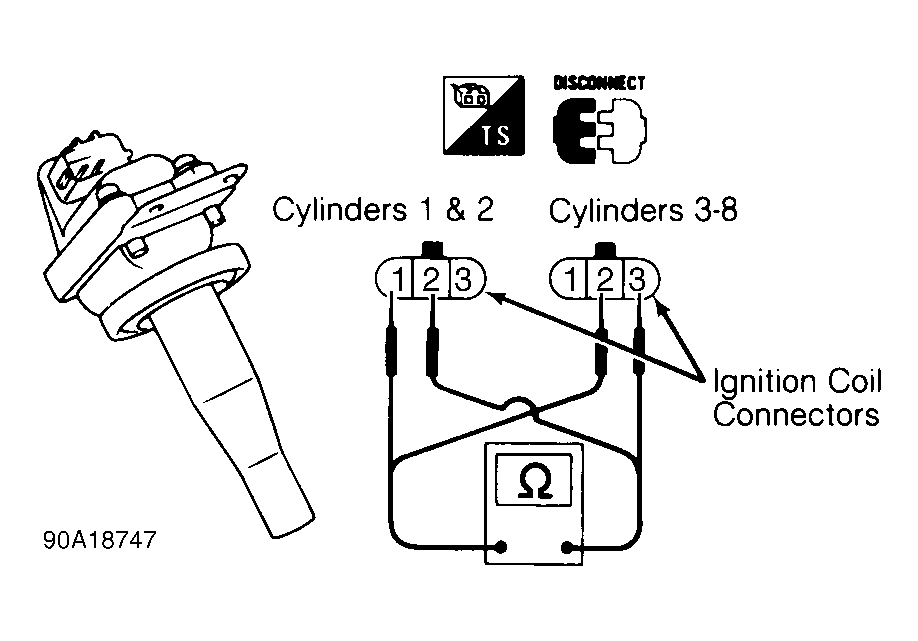 Disconnect ignition coil harness connector. Using ohmmeter, check resistance between coil terminals No. 1 and 2 (cylinders No. 1 and 2) and terminals No. 2 and 3 (cylinders No. 3 and 8). See Fig 1 . Resistance should be approximately .7 ohm. If resistance is not as specified, replace ignition coil.