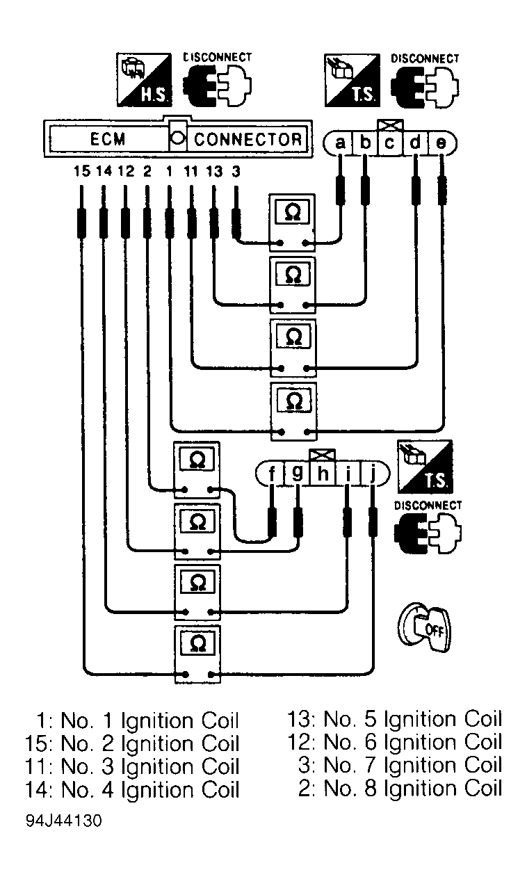 3. Check harness continuity between ECM and ignition coil in each cylinder. See Fig 1 . Continuity should be present. If continuity is not present, repair or replace harness or connectors.