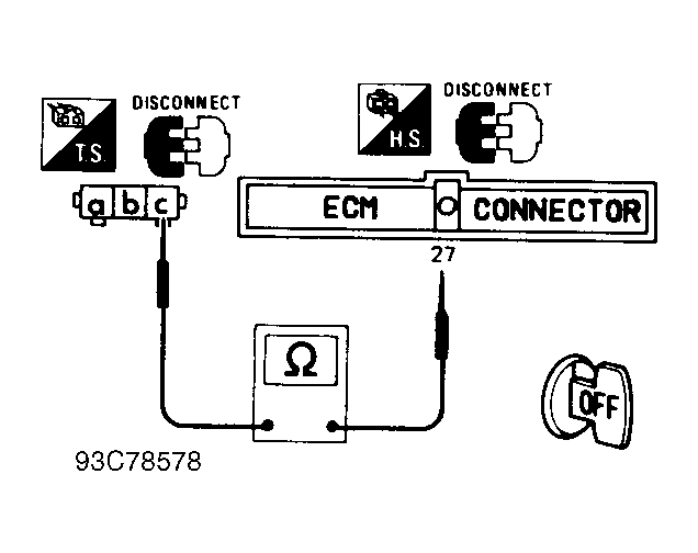 Turn ignition off. Disconnect ECM harness connector and EFI sub-harness No. 2 connector. Verify harness continuity between EFI sub-harness No. 2 connector terminal "c" (White wire) and ECM terminal No. 23, and connector terminal "f" (White wire) and ECM terminal No. 24. If continuity is present, go to next step. If continuity is not present, repair harness or connectors as necessary. See Figure