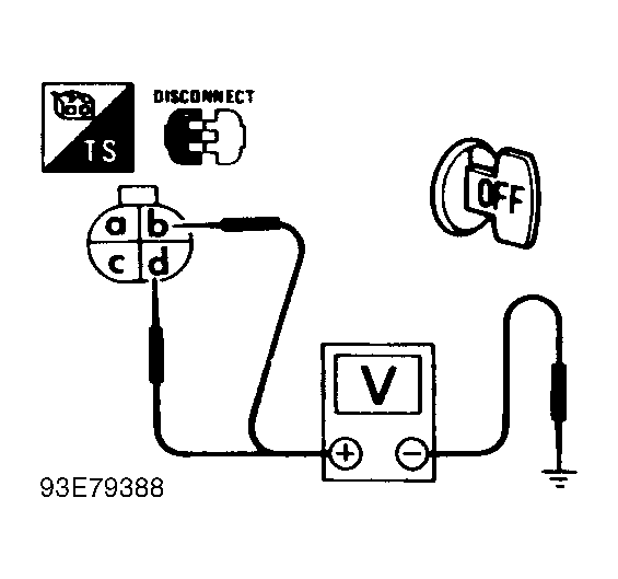Turn ignition off. Disconnect EFI sub-harness No. 1, 4-pin connector. Measure voltage between EFI sub-harness No. 1 connector terminals "b" (Red wire) and ground, and "d" (Red wire) and ground. See Fig 2 and Fig 3 . If battery voltage is present, go to next step. If battery voltage is not present, verify harness continuity between EFI sub-harness No. 1 connector and Blue EFI harness connector. If continuity is present, go to next step. If continuity is not present, repair harness or connectors as necessary. - Check Power Supply II