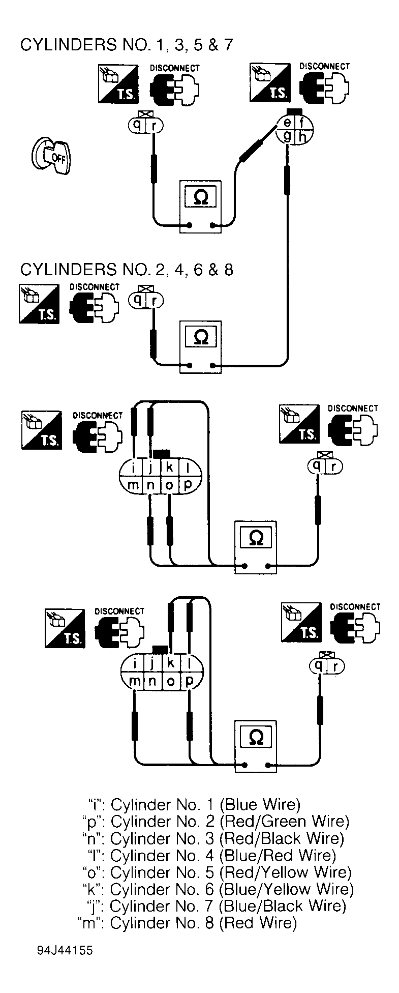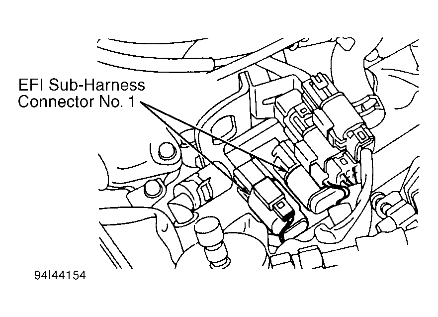 Turn ignition off and disconnect EFI sub-harness No. 1, 4-pin and 8-pin connectors. See Fig 2 . Verify harness continuity between 4-pin and 8-pin connector (injector side) terminals as follows:- Terminal "e" (Red wire) and terminal "i" (Blue wire).