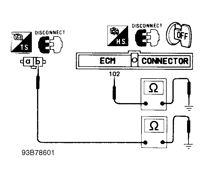 Turn engine off and disconnect ECM harness connector. Disconnect EGRC solenoid valve harness connector. Verify harness continuity between ECM terminal No. 102 (Blue/Red wire) and ground, and between EGRC solenoid valve harness connector terminal "b" (Blue/Red wire) and ground. See Fig 4