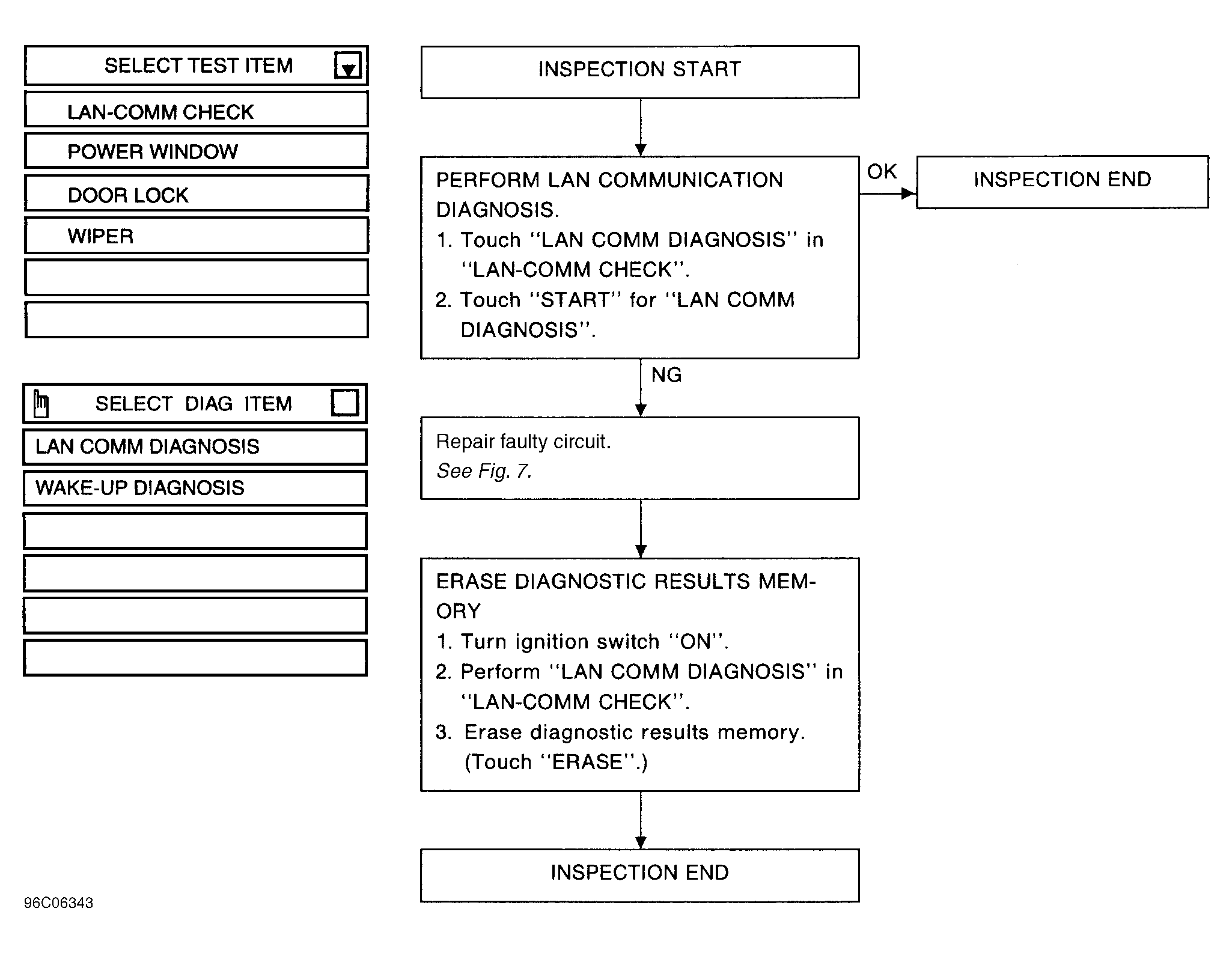 - Select LAN-COMM CHECK from the SELECT TEST ITEM menu on CONSULT. See LAN COMMUNICATION DIAGNOSTICS chart under DIAGNOSTIC CHARTS. See Figure . Select LAN COMM DIAGNOSIS from the SELECT DIAG ITEM menu. Record any LAN system-related fault messages and repair appropriate circuit. See Figure . Erase fault message(s) from system memory.