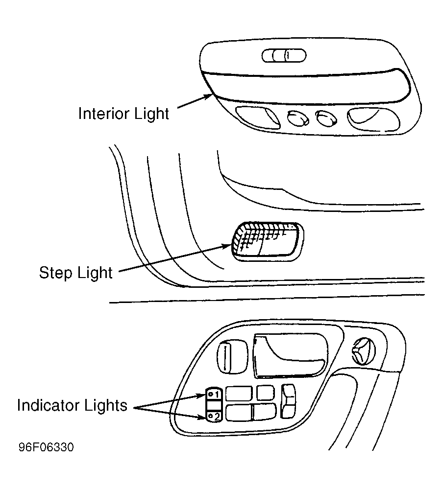 Interior light, step lights (all seats) and automatic drive positioner indicator lights are used in on-board diagnostics to indicate system malfunctions. See Fig 1 . Depending on the on-board diagnostic mode, self-diagnostic indicator light(s) will either flash trouble codes or display some specific patterns to indicate the malfunctioning item.