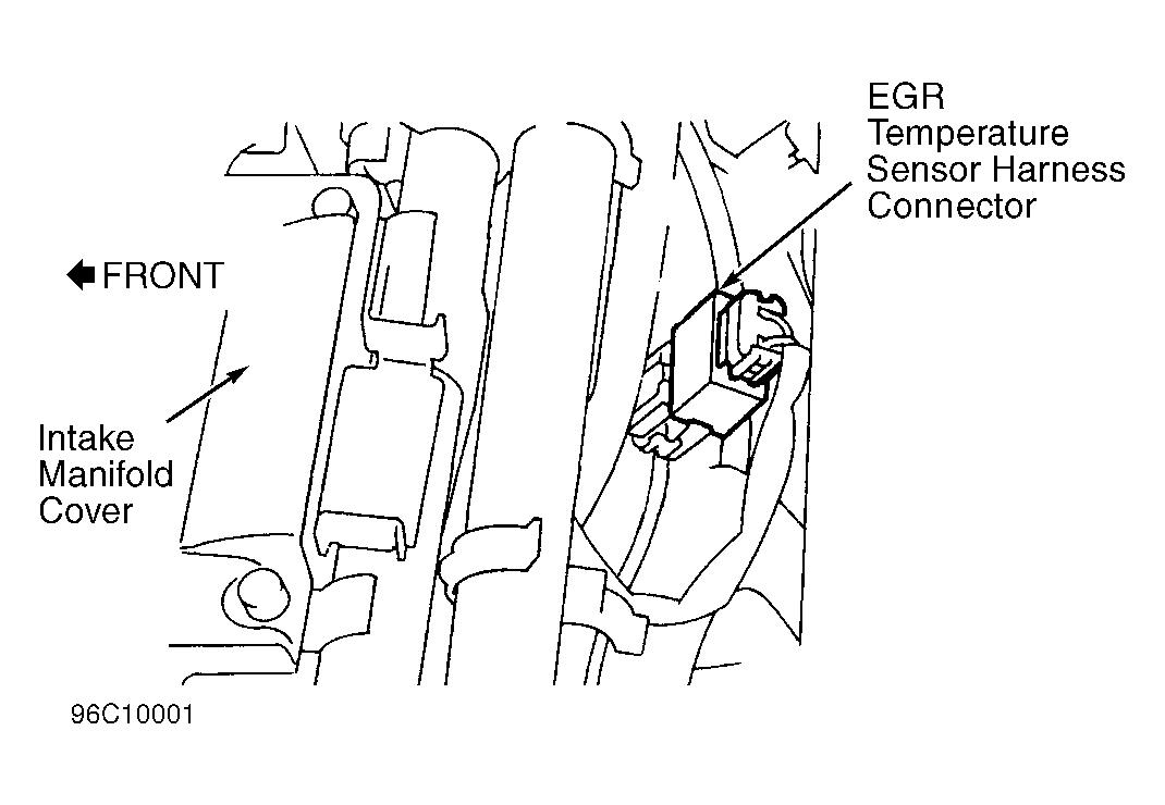 - Disconnect EGR temperature sensor harness connector. See Fig 1. Measure resistance of EGR temperature sensor. See EGR TEMPERATURE SENSOR RESISTANCE table. If EGR temperature sensor is okay, go to next step. Repair or replace if necessary and perform FINAL CHECK.EGR TEMPERATURE SENSOR RESISTANCE