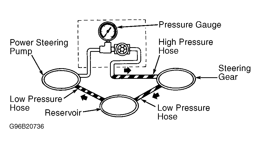 - Disconnect high pressure hose at power steering pump. Install Pressure Gauge (ST27091000) between power steering pump and steering gear. See Fig 1. Fully open shutoff valve and bleed air from system. See HYDRAULIC SYSTEM BLEEDING under LUBRICATION. Ensure fluid level is correct.