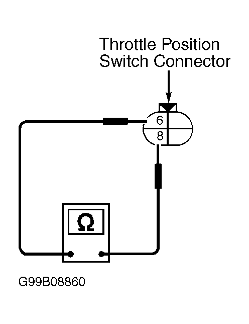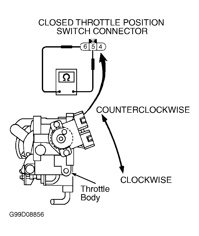 - On all models, disconnect closed throttle position switch harness connector. Check continuity between appropriate terminals with specified feeler gauge inserted between throttle adjusting screw and throttle drum. See FEELER GAUGE THICKNESS table. See Fig 2, Fig 3 or Fig 4 .
