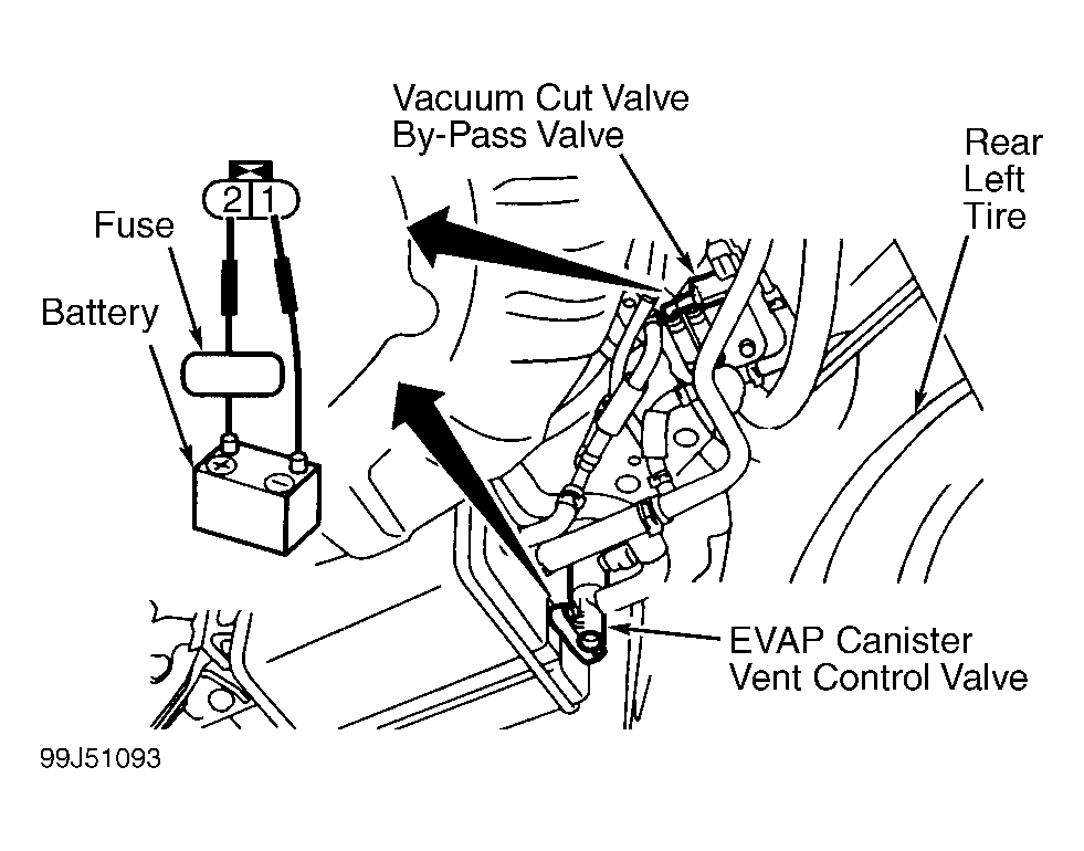 Connect suitable pressure pump with gauge to EVAP service port. See VACUUM DIAGRAMS article for location. Using jumper wires, apply battery voltage to EVAP Canister Vent Control Valve (EVAP-CVCV) and Vacuum cut valve by-pass valve. See Fig 1, Fig 2, or Fig 3 . Apply.2-.4 psi (1.38-2.76 kPa) of pressure to EVAP service port. Remove pressure pump from EVAP service port. Using Leak Detector (J41416), locate EVAP system leak.