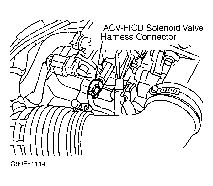 Remove IACV-FICD. See Figure. Using jumper wires, apply battery voltage to IACV-FICD terminals. IACV-FICD should click when jumper wires are connected and disconnected. Inspect IACV-FICD plunger for sticking. Also check for broken spring.