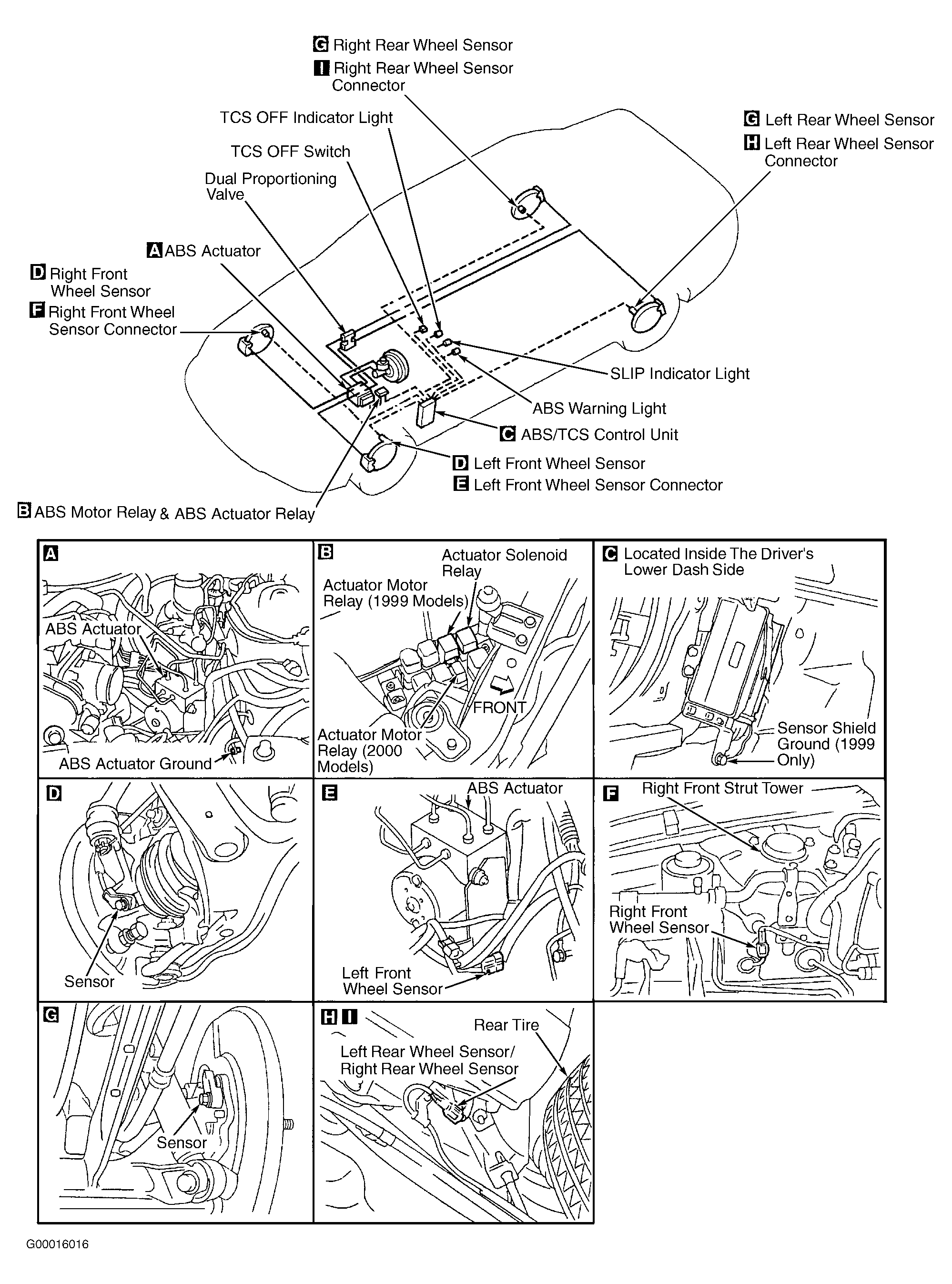The Anti-Lock Brake System (ABS) prevents wheel lock-up during abrupt braking or when braking on slippery surfaces. The system detects wheel rotation rate and electronically controls fluid pressure applied to brakes. The Traction Control System (TCS) limits wheel spin during acceleration on slippery surfaces by cutting fuel to certain cylinders and changing transmission shift points. ABS/TCS components include ABS/TCS control unit, ABS actuator assembly, TCS OFF switch, 2 front wheel sensors and 2 rear wheel sensors. See Fig 1 .
