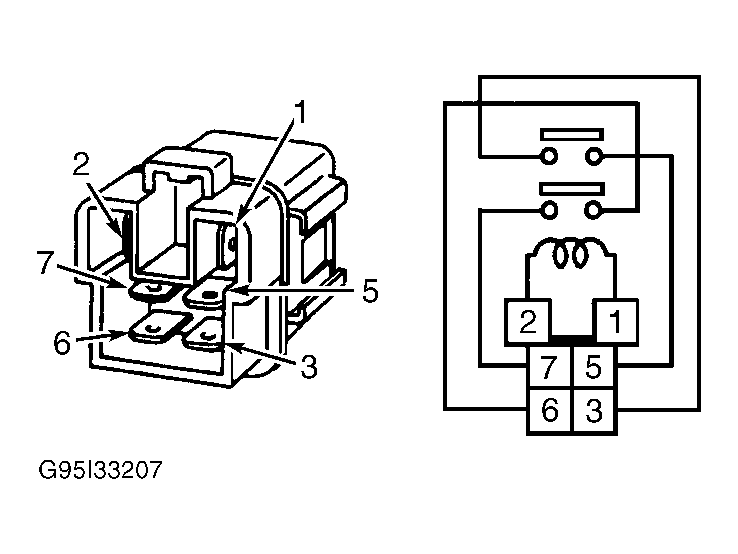 - Using jumper wires, apply battery voltage and ground to ECM relay terminals No. 1 and 2. See Figure. Check continuity between terminals No. 3 and 5. Also check continuity between terminals No. 6 and 7. Continuity should exist. Remove jumper wires. Continuity should not exist. If operation is as specified, go to step 12. If operation is not as specified, replace ECM relay and retest system.