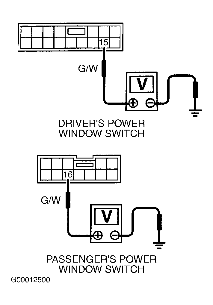- Reconnect suspect window regulator connector. Ensure window is fully open. Access power window switch harness connector. Do not disconnect connector. Turn ignition on. Backprobing connector, measure voltage between ground and terminal No. 15 (driver's side) or No. 16 (passenger's side). See Fig 1