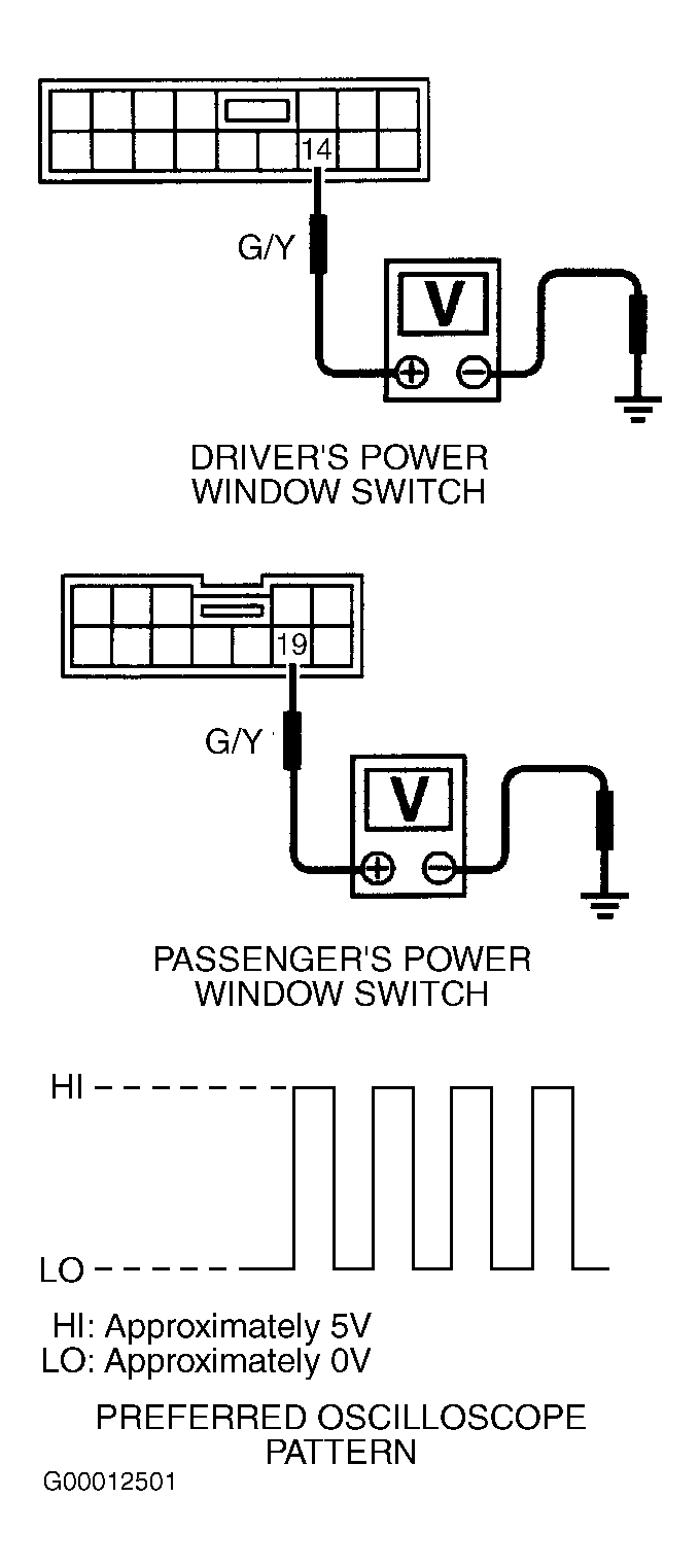 . Raise window using automatic function. Square wave pattern should oscillate between zero to 5 volts. If oscilloscope pattern is as specified, replace power window switch. If oscilloscope pattern is not as specified, replace window regulator motor.