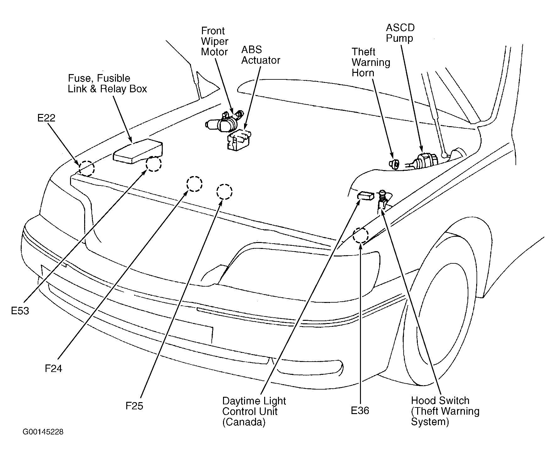 Daytime Light Control Unit (Canada) Left side of engine compartment. See Figure .