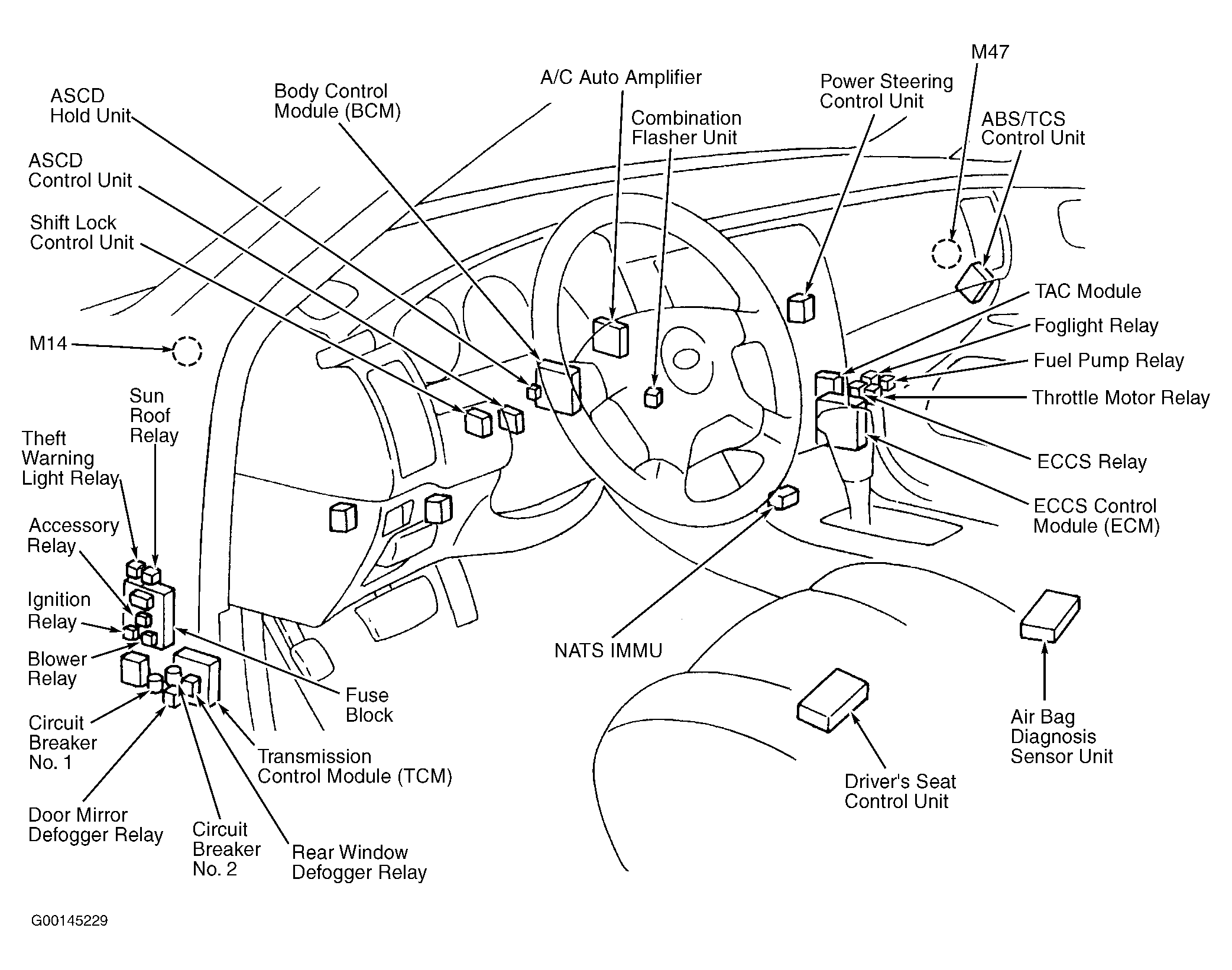 ASCD Control Unit Behind dash, left of steering column. See Figure .