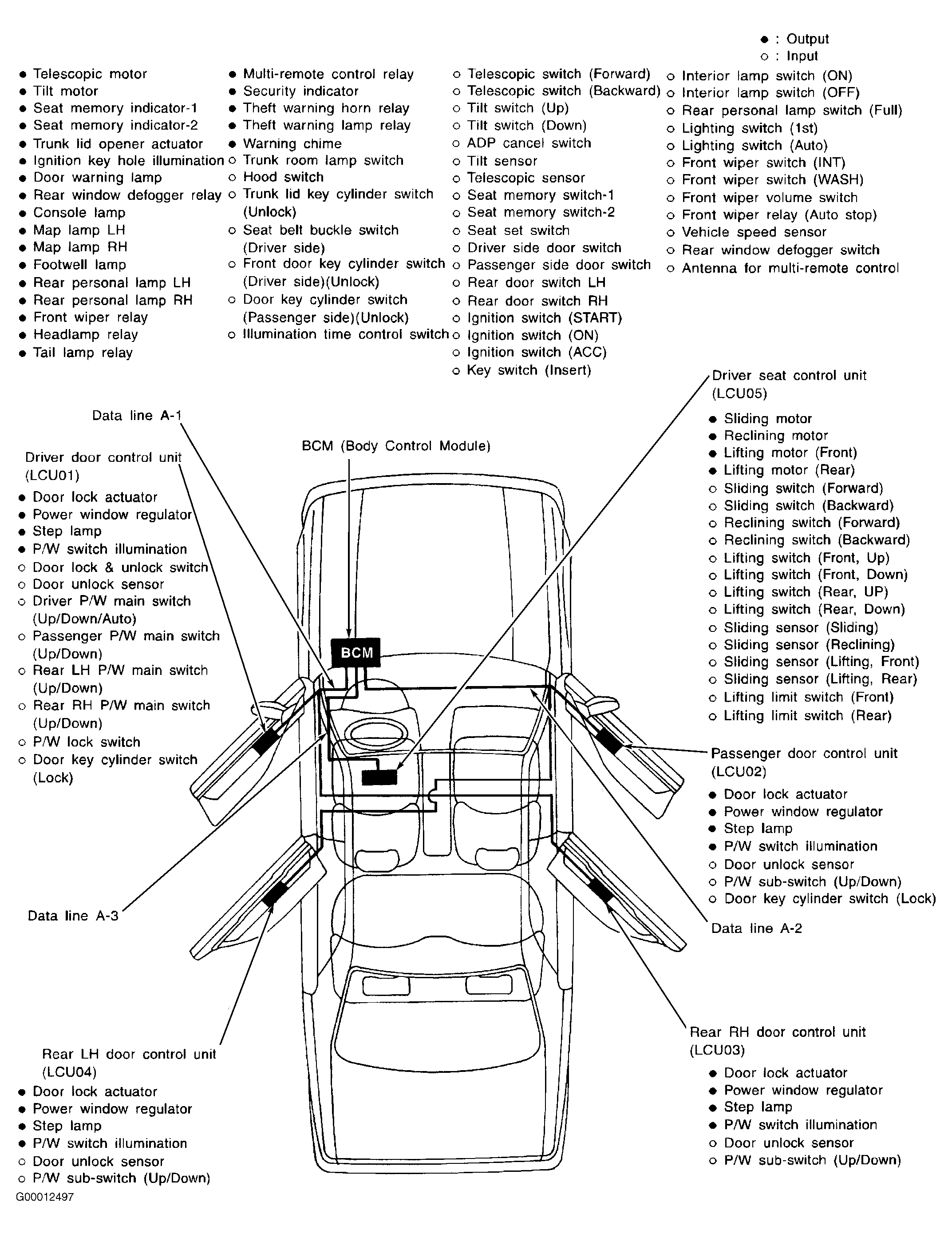 The multiplex control system uses a Body Control Module (BCM) and 5 Local Control Units (LCUs) to manage the following electrical systems in the vehicle: power window control, power door lock control, automatic drive positioner control (driver-side power seat and steering column control), anti-theft system, step light control, illumination control, multi-remote control, auto light control (headlights), warning chime and light control, wiper amplifier control, rear window defogger timer control and self-diagnostic system. See Fig 1 -Figure . See COMPONENT LOCATIONS . Some electrical systems are directly connected to the BCM, while some electrical loads and switches are connected to the appropriate LCU.