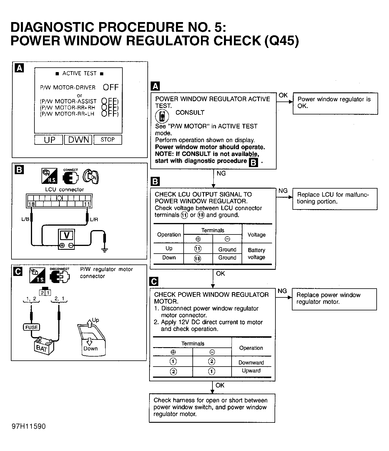 - If affected power windows do not operate from main switch or independent window switch, perform DIAGNOSTIC PROCEDURE 5: POWER WINDOW REGULATOR CHECK under DIAGNOSTIC TESTS. See Figure . If affected power windows do not operate only when using its independent window switch, perform DIAGNOSTIC PROCEDURE 4: POWER WINDOW SUB-SWITCH CHECK under DIAGNOSTIC TESTS. See Figure . If affected power windows do not operate from main switch only, perform DIAGNOSTIC PROCEDURE 3: POWER WINDOW MAIN SWITCH CHECK under DIAGNOSTIC TESTS. See Figure .
