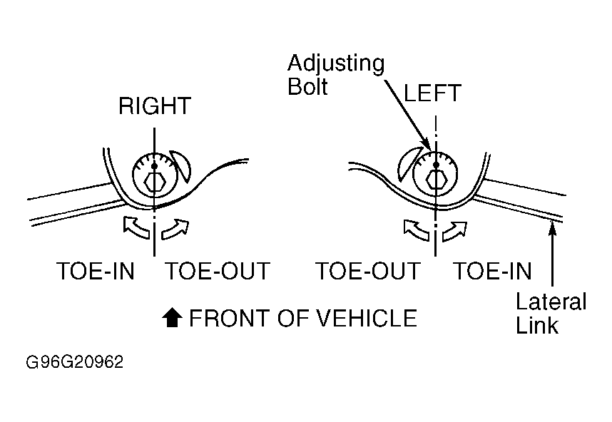 Ensure camber is correct. Bounce both ends of vehicle several times to settle suspension. Measure toe-in. See WHEEL ALIGNMENT SPECIFICATIONS . Adjust toe-in by rotating adjustment bolts. See Fig 1. Toe-in changes about .06" (1.5 mm) per side with each graduation of adjustment pin.