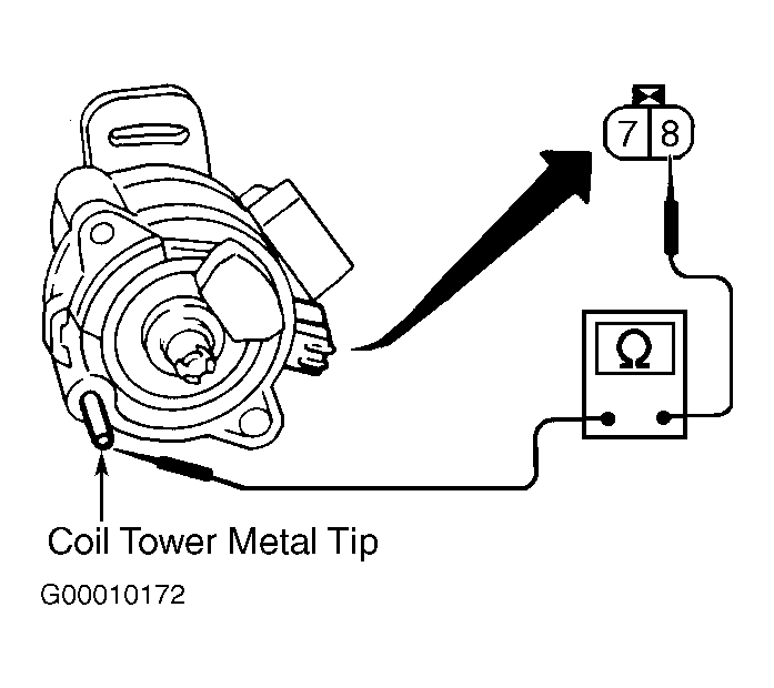 5. Measure resistance between distributor 2-pin connector terminals. Also measure resistance between ignition coil tower and distributor 2-pin connector terminal No. 8. See Fig 2. See IGNITION COIL RESISTANCE  table. If resistance is as specified, go to next step. If resistance is not as specified, replace distributor assembly and retest system.