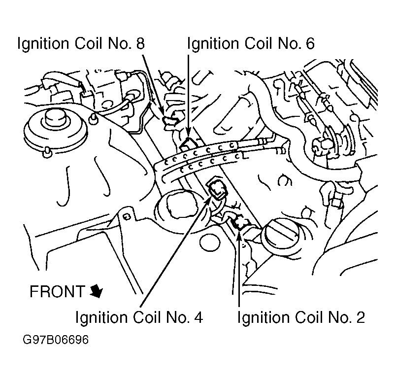 - Turn ignition off. Loosen and retighten engine ground bolts. See Figure. Check continuity between engine ground and appropriate ignition coil harness connector(s) terminal No. 2 (Black wire). Also, check circuit for short to voltage. See WIRING DIAGRAMS article. Repair circuit as necessary and retest system. If ground circuit is okay, go to next step.