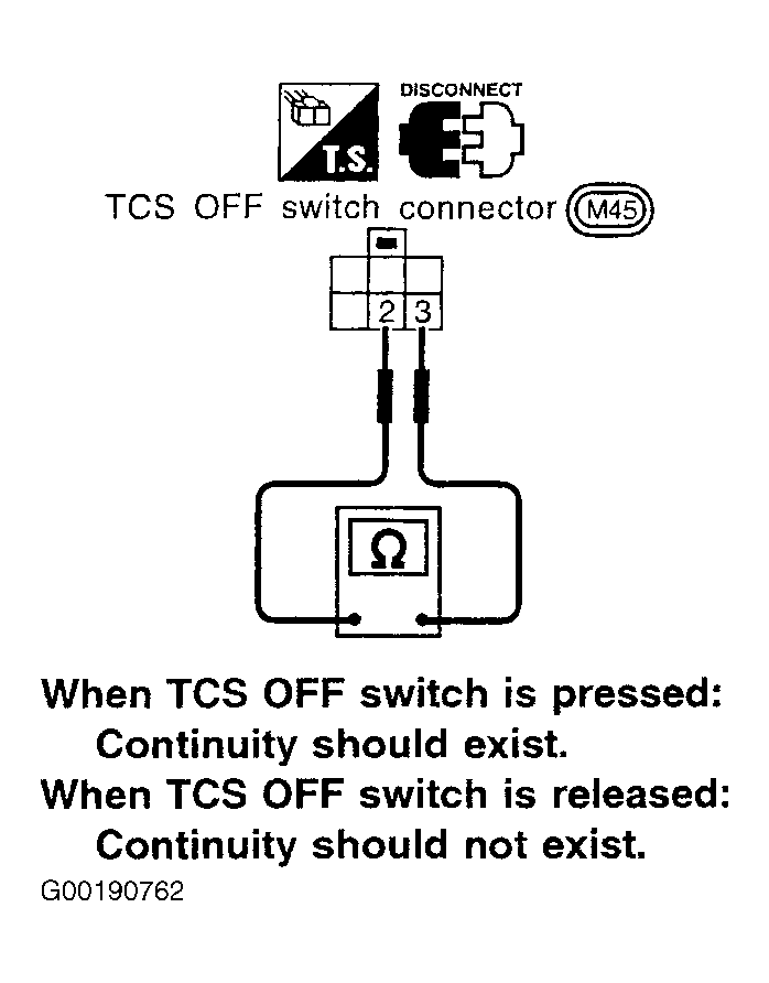 . Depress switch, continuity should exist. Release switch. Continuity should not exist. If continuity is as specified, go to next step. If continuity is not as specified, replace TCS OFF switch.