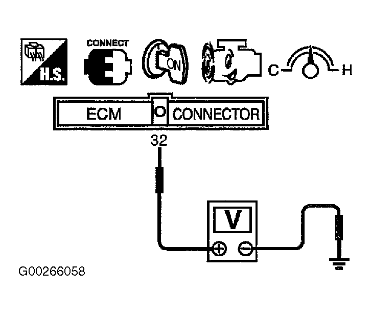 - Set voltmeter probes to ECM terminals No. 32 (EVAP control system pressure sensor signal) and ground. See Fig 1.