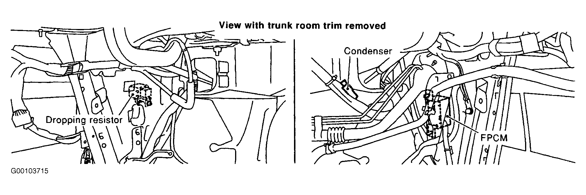4. Turn ignition switch to OFF position. Disconnect fuel pump harness connector located under trunk trim. Disconnect dropping resistor harness connector. See Fig 1. Check continuity of the following: