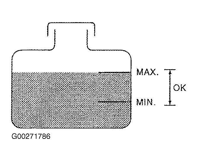 1. Check the coolant level in the reservoir tank and radiator. Allow engine to cool before checking coolant level. See Fig 1. If the coolant level in the reservoir tank and/or radiator is below the proper range, skip the following steps and go to PROCEDURE "A" under DIAGNOSTIC PROCEDURE .