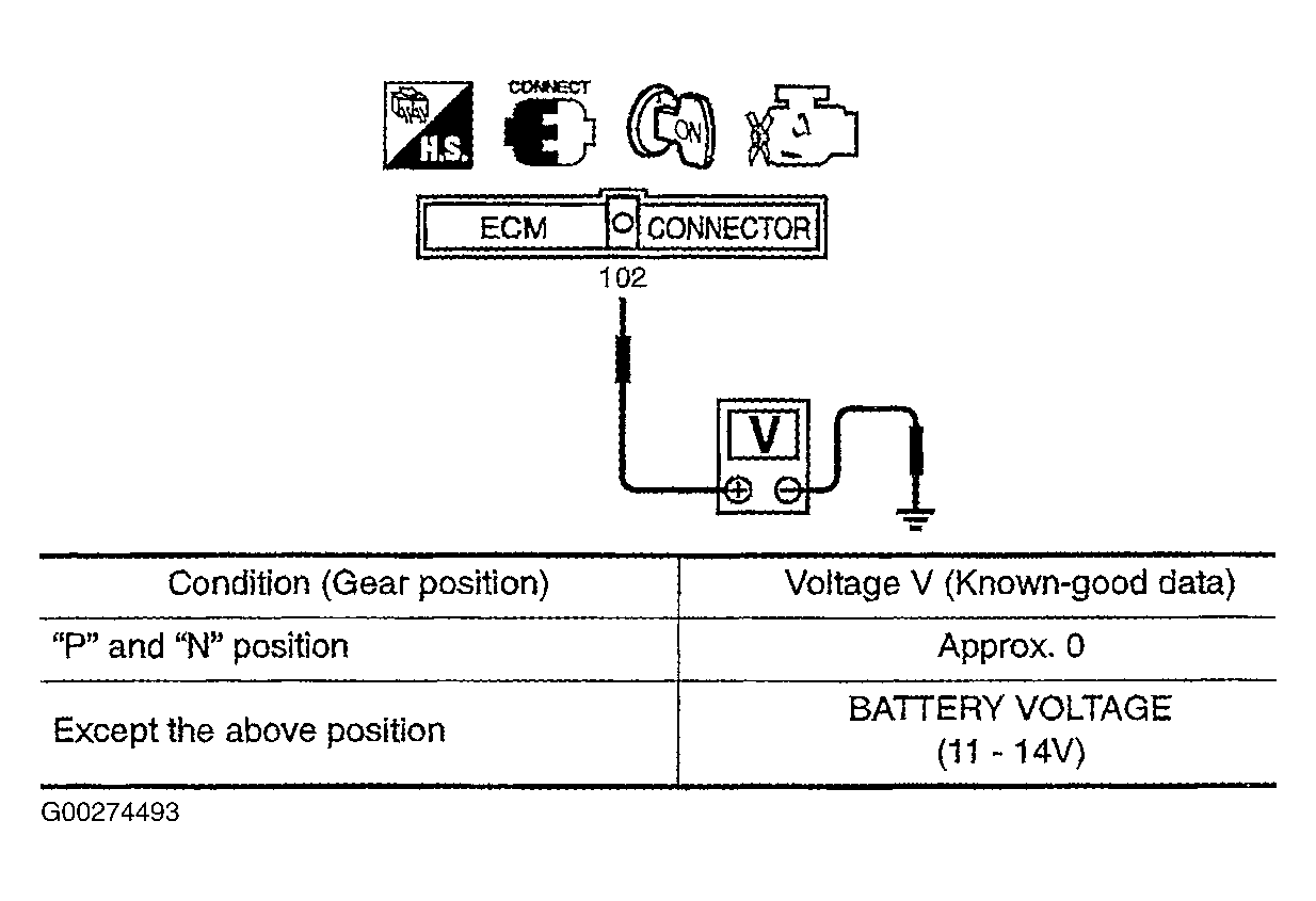 - Check voltage between ECM terminal No. 102 (PNP switch signal) and ground under conditions specified. See Fig 1.