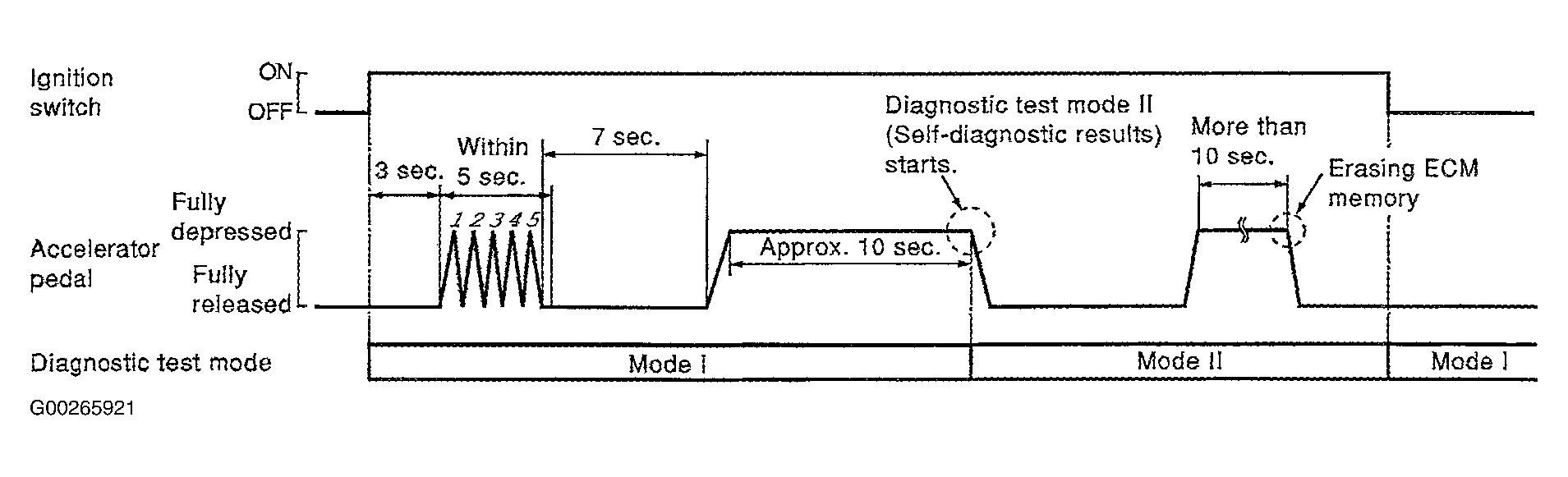 It is better to count the time accurately using a clock. It is impossible to switch the diagnostic mode when an accelerator pedal position sensor circuit has a malfunction. ECM always returns to Diagnostic Test Mode I after ignition switch is turned to OFF position.