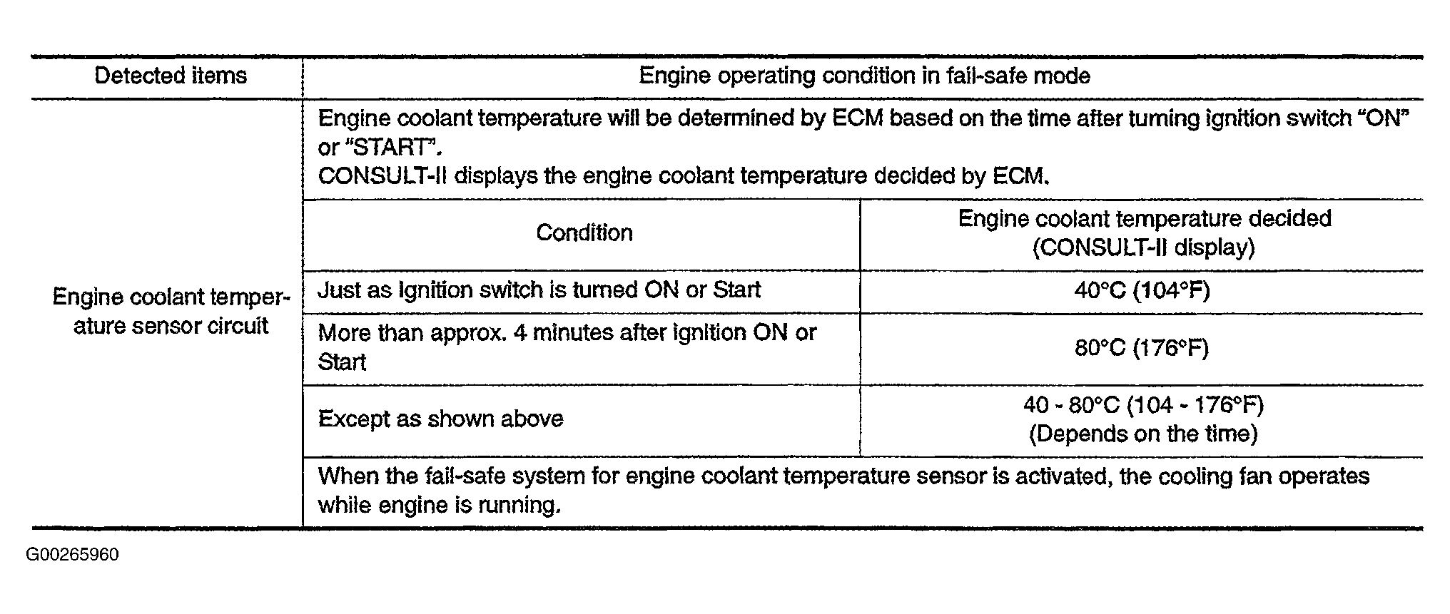 Home >> Infiniti >> 2003 >> FX35 RWD >> Repair and Diagnosis (Single Page) >> Engine Performance >> System >> Engine Controls - Self-Diagnostics >> Diagnostic Tests >> DTC P0117: Engine Coolant Temperature Sensor Circuit Low Input & DTC P0118: Engine Coolant Temperature Sensor Circuit High Input >> Fail-Safe Mode